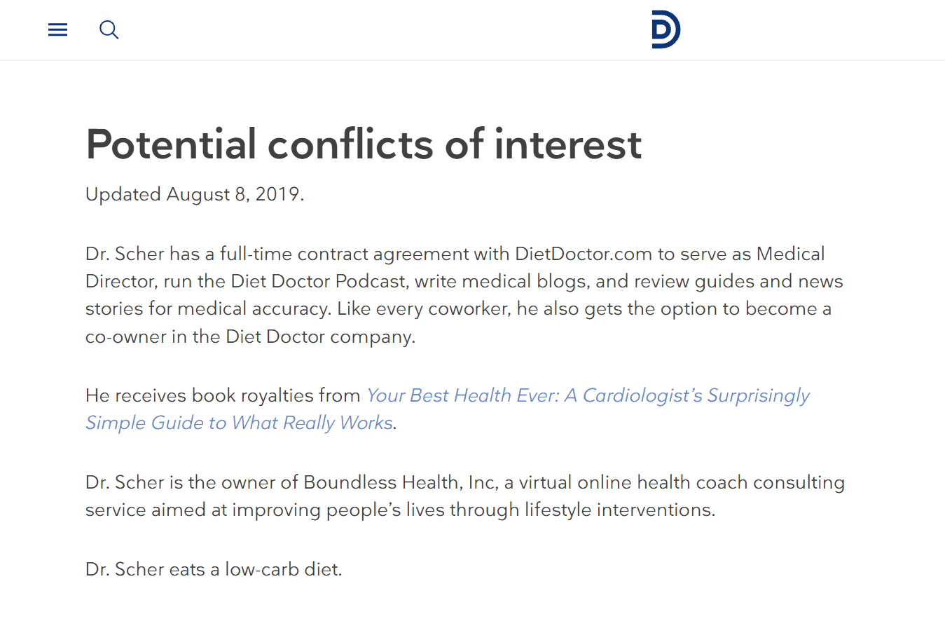 There are also contact links, a list of all the articles this particular Doctor has written and reviewed. However, what’s most notable is that the profile page includes a “Potential conflicts of interest” section.