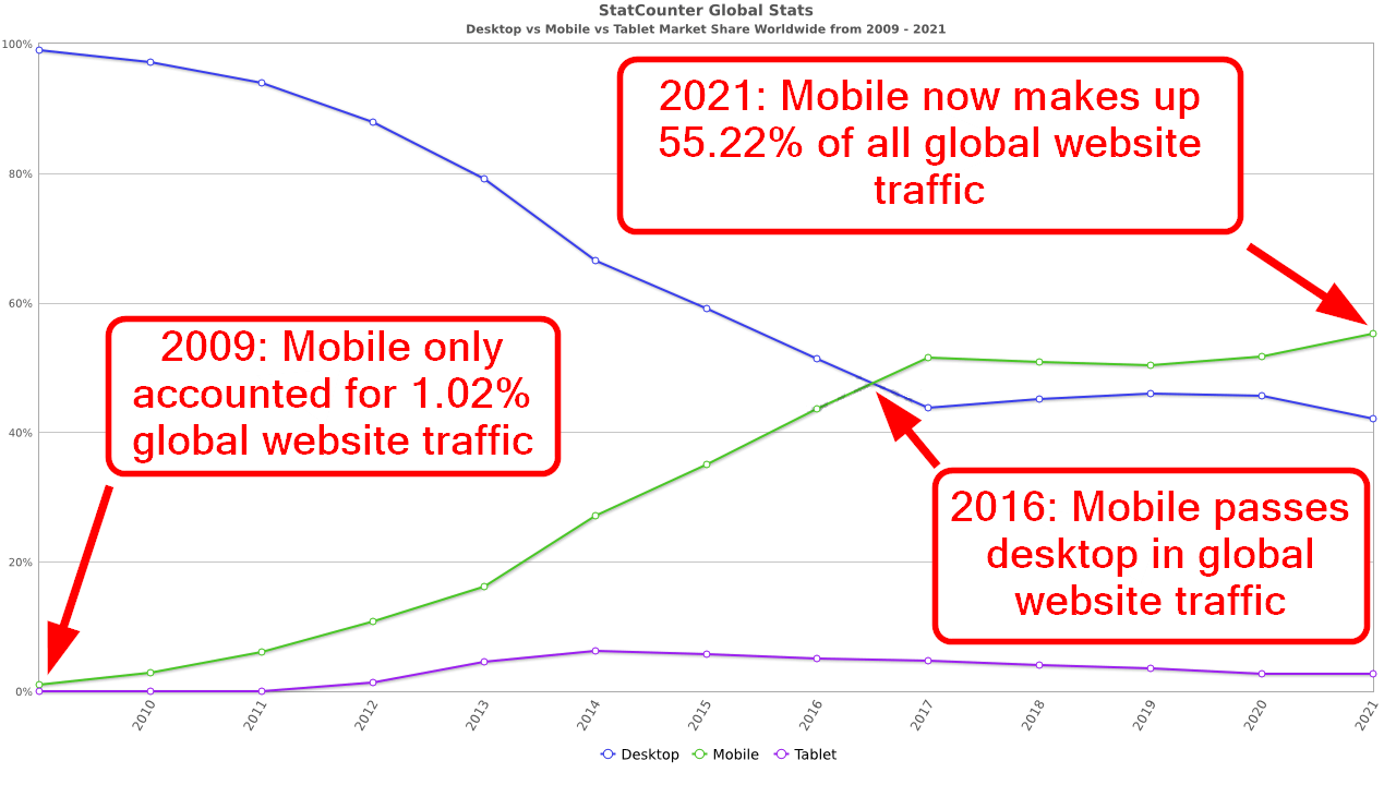 Did you know that 55.22% of all global website traffic comes from mobile devices? Ever since smartphones hit the scene, desktop usage has dropped, while mobile and tablets have soared. It was around 2016 when mobile officially became the dominant device for using the internet.