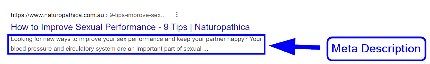 It’s a few short sentences that tell what to expect on the page. Although it doesn’t directly impact search rankings, it has an indirect influence. A persuasive meta description can increase the click-through rate, which does affect rankings.